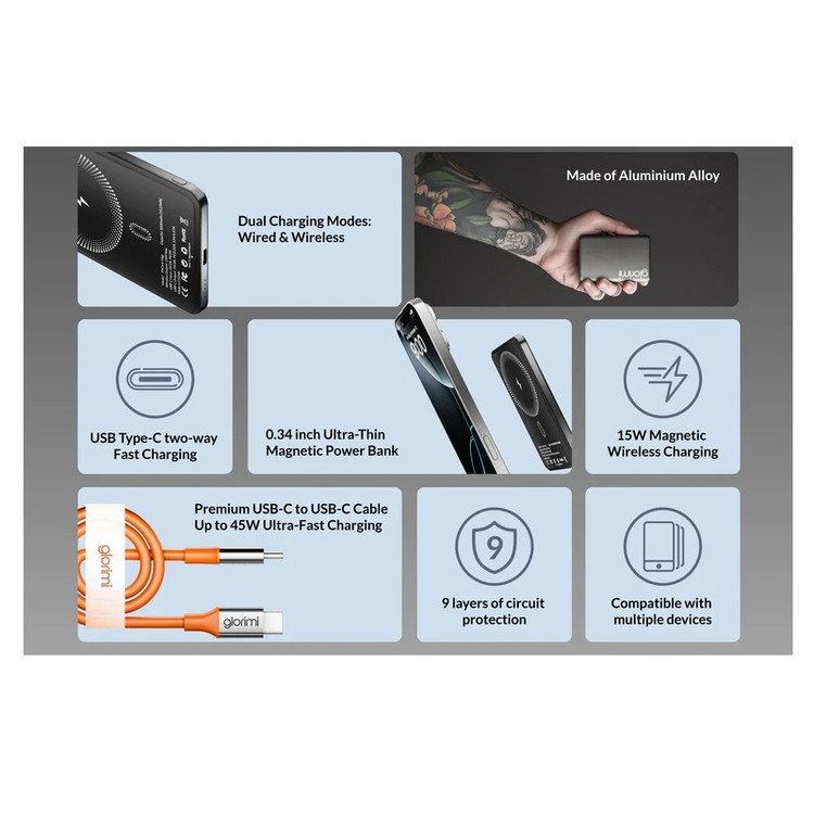 اگر به دنبال یک پاوربانک سبک، باریک و مجهز به شارژ بیسیم مغناطیسی هستید، مدل Glorimi FitCore Mag 20W ظرفیت ۵۰۰۰mAh انتخابی ایدهآل است. این پاوربانک برای استفاده روزمره، سفر و شارژ سریع گوشیهای آیفون و اندروید بسیار کاربردی خواهد بود.