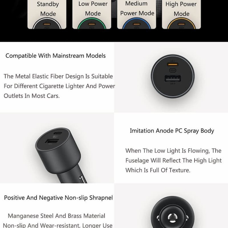 شارژر فندکی خودرو شیائومی مدل 1A1C MDY-16-ER از طریق پورت USB-C تا ۱۰۰ وات برق ارائه میدهد و شامل یک پورت USB-A است که امکان شارژ همزمان دو دستگاه با حداکثر خروجی ترکیبی ۶۸ وات را فراهم میکند. این شارژر از چندین پروتکل شارژ سریع مانند QC 3.0 و PD 3.0 پشتیبانی میکند و آن را با گوشیهای هوشمند، تبلتها و لپتاپها، از جمله Mi 10 Ultra شیائومی، سازگار میسازد. این شارژر دارای طراحی بادوام، نشانگر LED و محافظت داخلی در برابر ولتاژ اضافی، جریان اضافی، اتصال کوتاه و گرمای بیش از حد است که شارژ ایمن و کارآمد را در حال حرکت تضمین میکند. این شارژر با یک کابل ۱ متری USB-C به USB-C با تراشه E-Marker برای پشتیبانی از جریان بالا ارائه میشود.